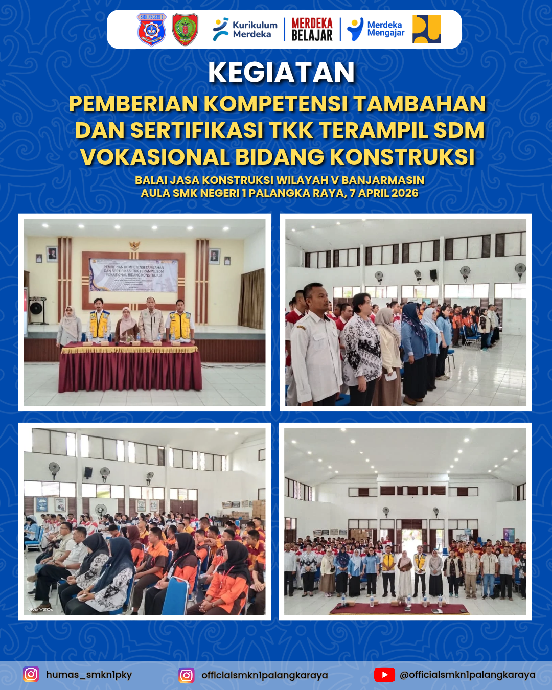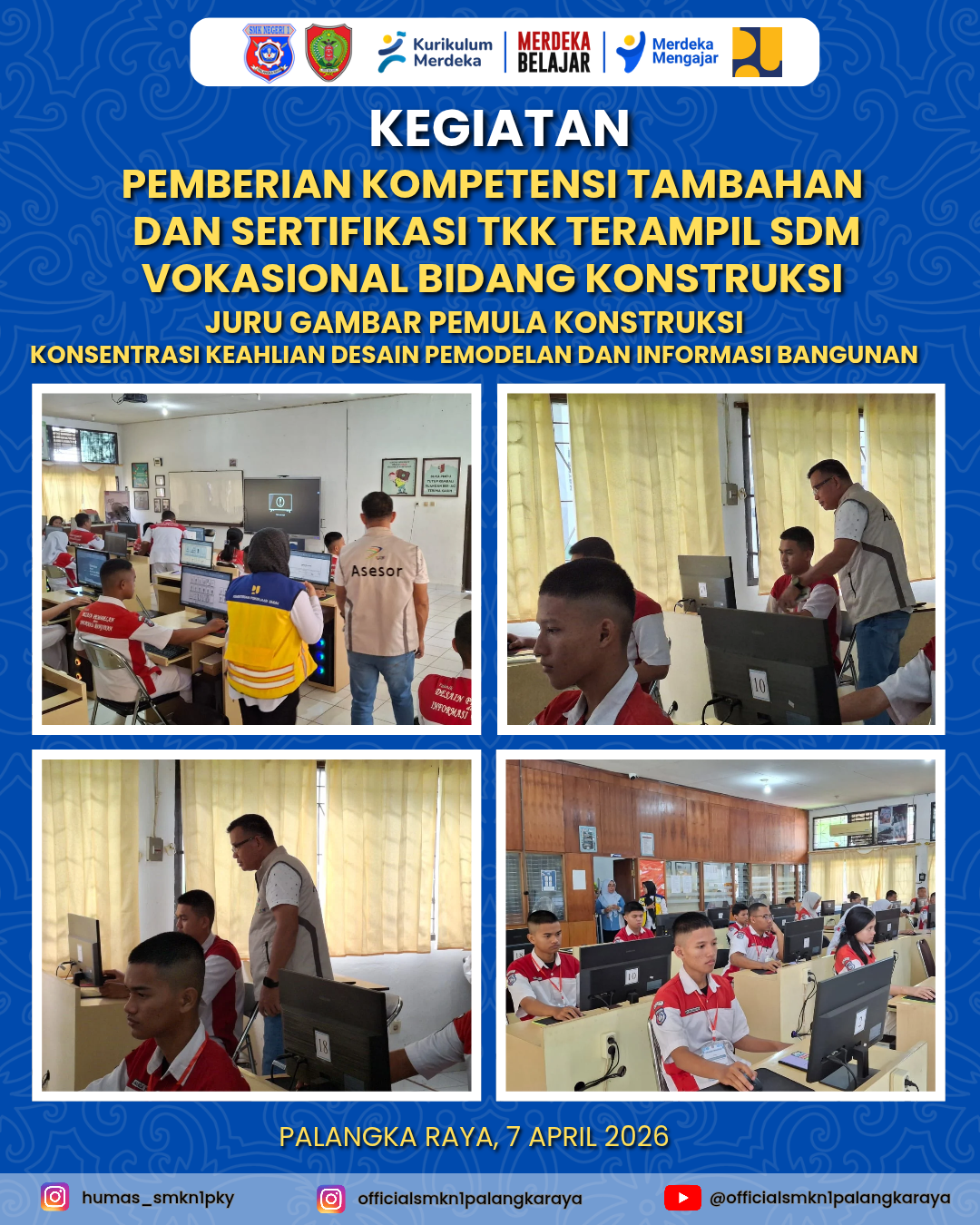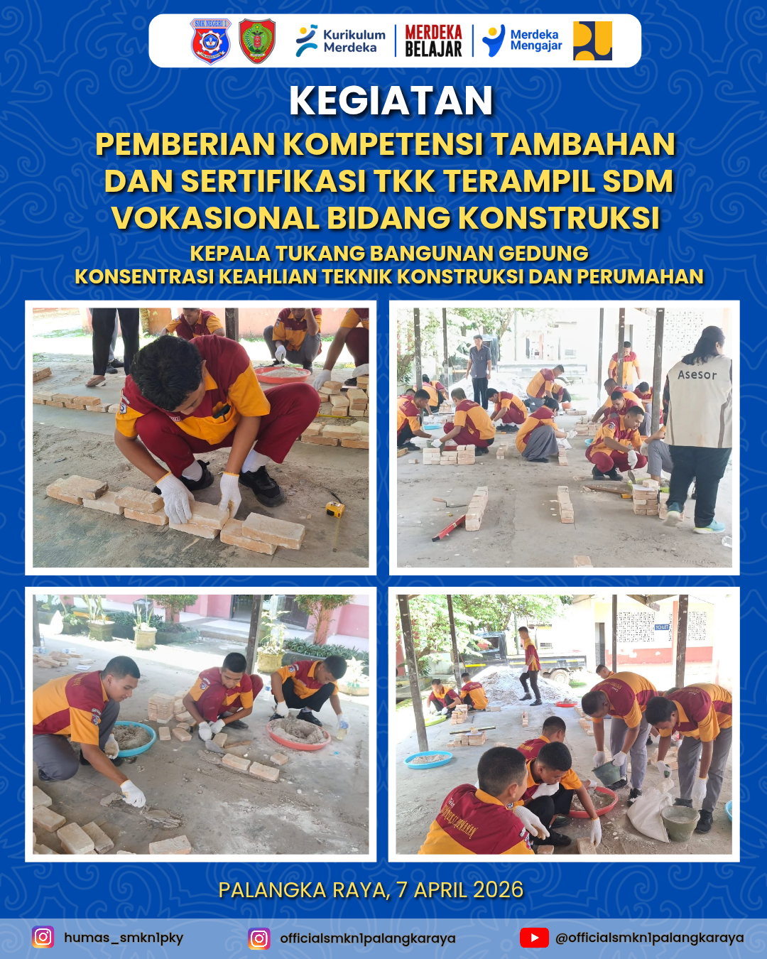 Pelaksanaan tahap pertama ini berlangsung pada 1–2 April dan dilanjutkan pada 7 April 2026. Program tersebut bertujuan meningkatkan kompetensi dan profesionalisme siswa sesuai standar tenaga kerja konstruksi yang berlaku.
